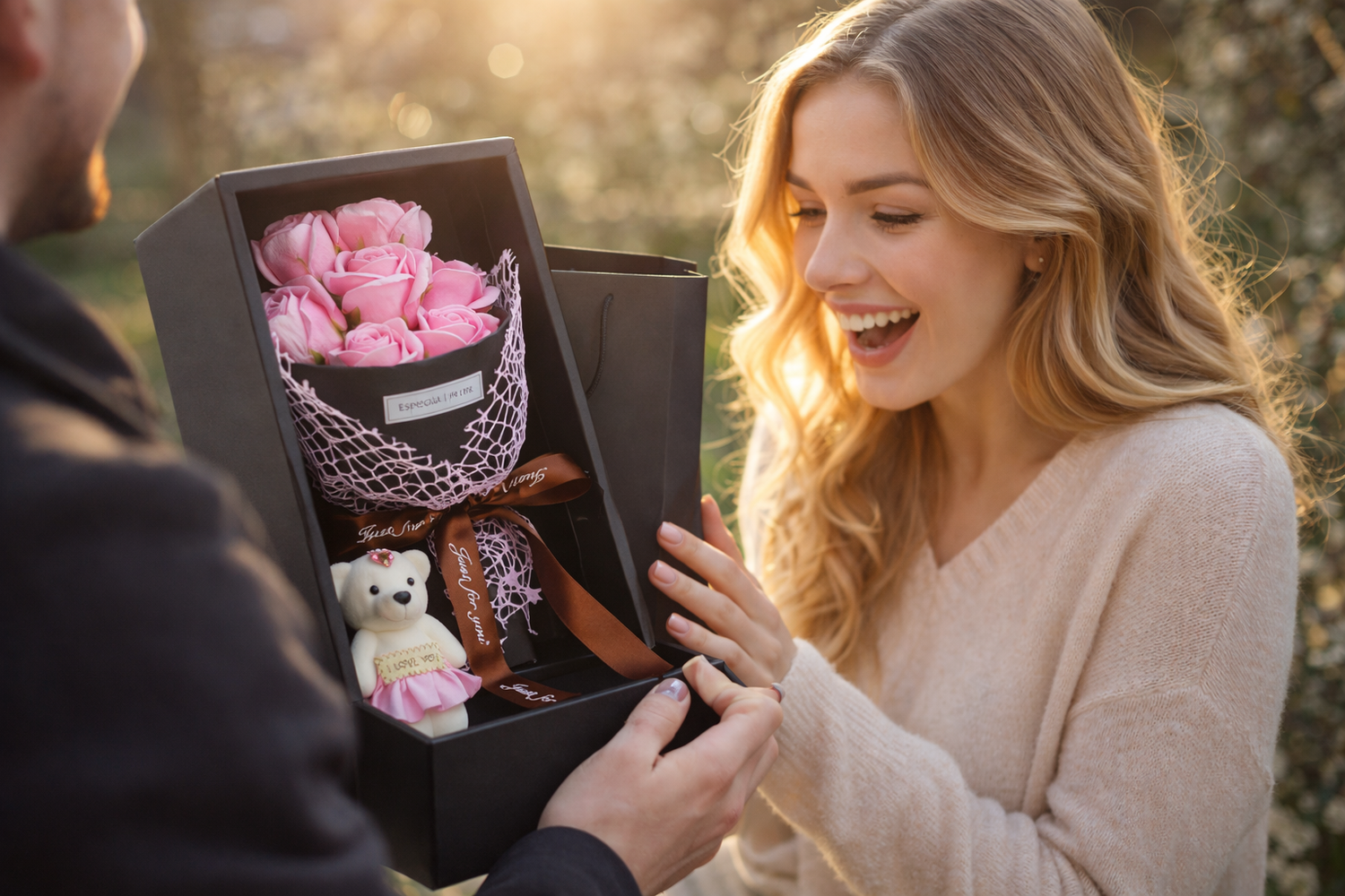 Wyobraź sobie uśmiech, błysk w oczach i szczere „WOW”, gdy otworzy eleganckie czarne pudełko z pachnącymi mydlanymi różami i uroczym misiem. To nie jest zwykły prezent – to emocja zamknięta w pudełku.
